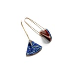 These earrings are cut from a red jasper from the depths of the Owyhee canyonlands. The pink is rhodonite from the copper mines in Butte, Montana. They are backed for strength with Afghan lapis.